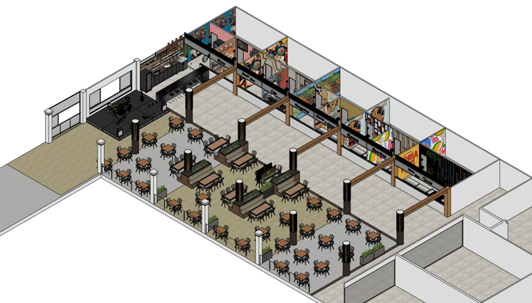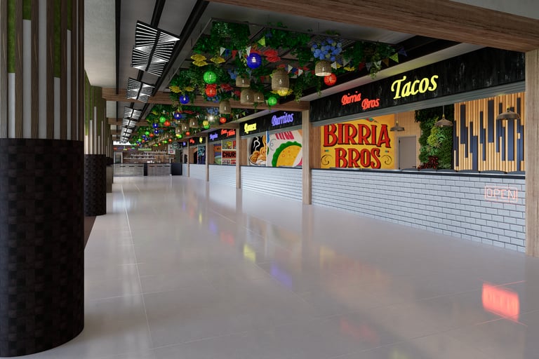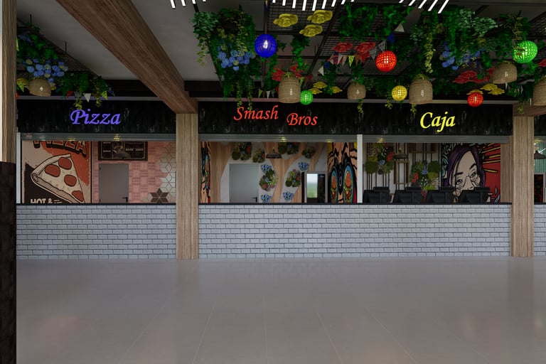 Patio de comidas concebido como un espacio gastronómico contemporáneo, con una identidad visual marcada y un ambiente dinámico.