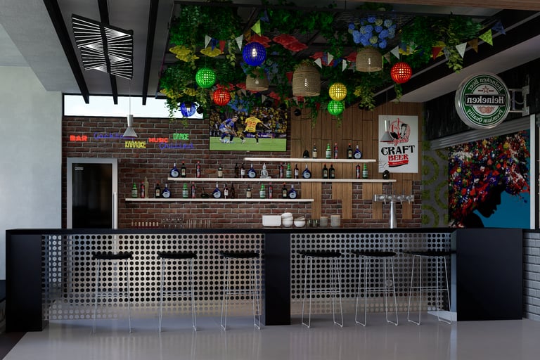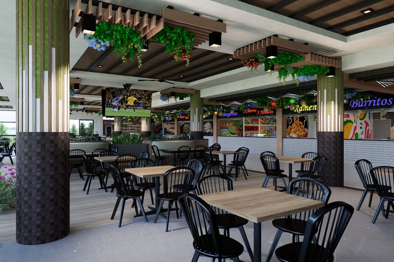 El diseño integra áreas comunes y locales de comida, priorizando la funcionalidad, la circulación fluida y una atmósfera acogedora mediante materiales, iluminación y elementos decorativos.