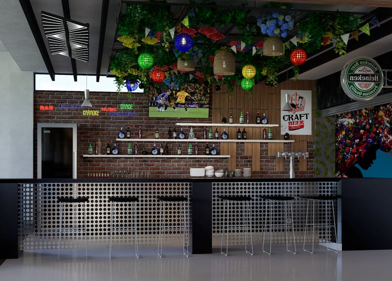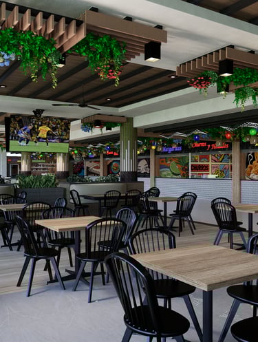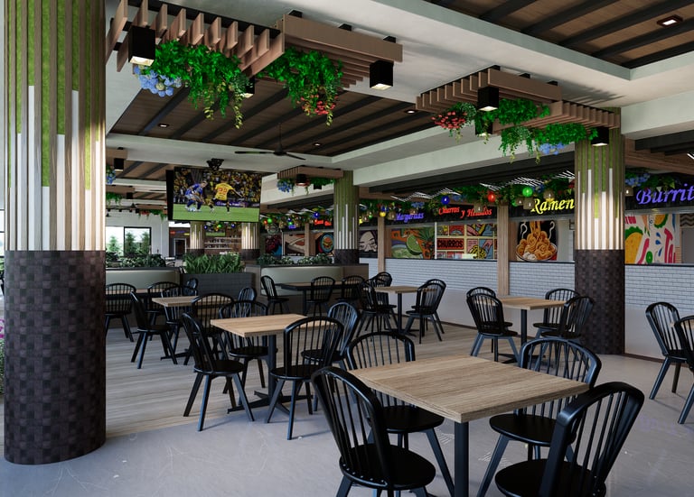 Patio de comidas desarrollado como un espacio gastronómico contemporáneo, concebido para integrar distintas propuestas culinarias en un ambiente dinámico y atractivo. El diseño busca generar una identidad visual marcada, combinando materiales, color y elementos decorativos que refuerzan una experiencia actual.